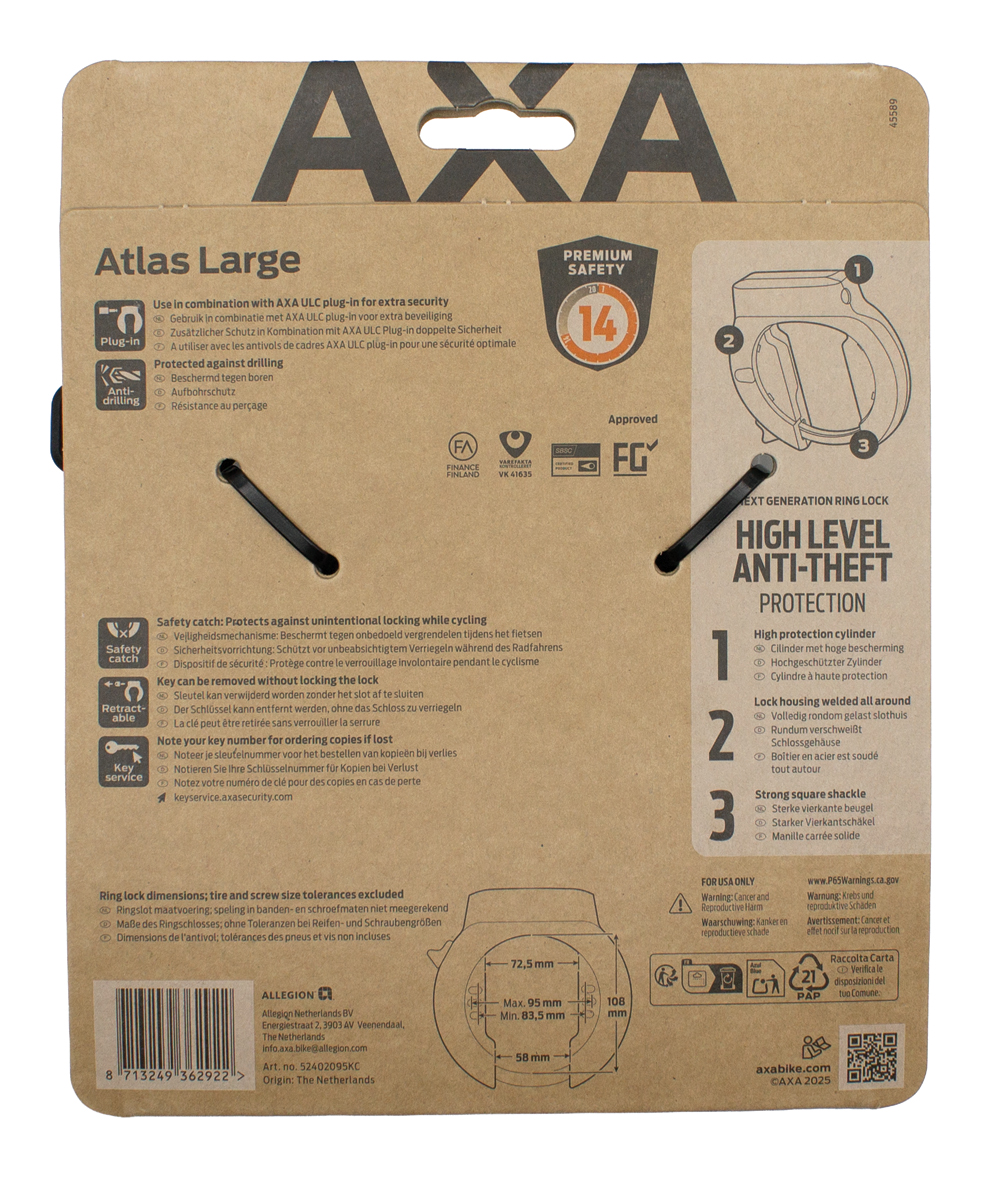 Kompatibel mit dem ULC-Steckketten-Portfolio ermöglicht dir das Atlas eine sichere Befestigung an festen Objekten mit nur einem Handgriff. Integrierte Stoßdämpfer minimieren störende Geräusche, und das kompakte Design bietet Platz für Reifen bis zu 58 mm Breite. Dank des AXA-Schlüsselservices kannst du Ersatzschlüssel schnell und unkompliziert bestellen. Das Atlas Ringschloss ist dein zuverlässiger Begleiter für eine sichere Fahrrad-Zukunft.