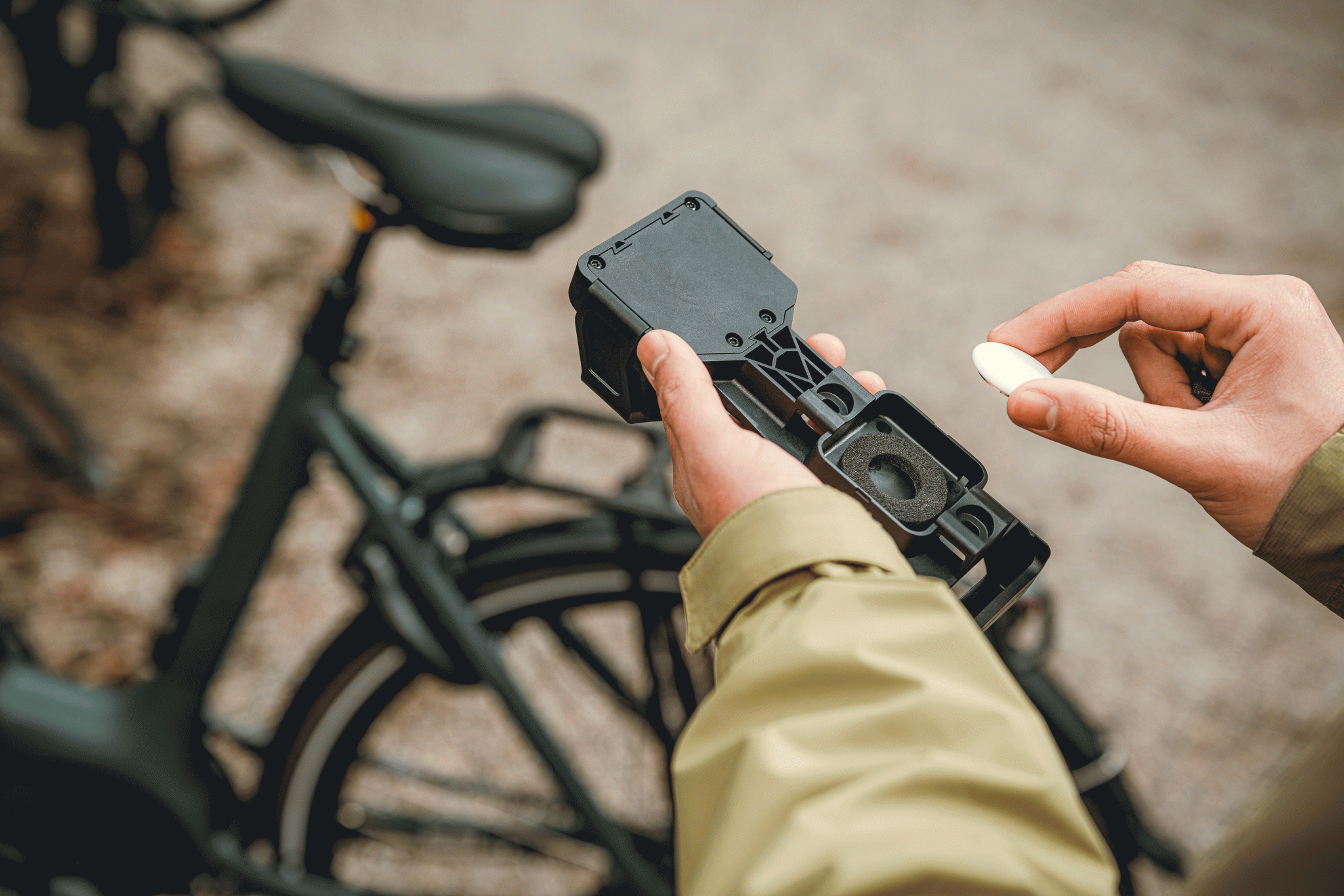 De houder is ontworpen om trillingsvrij te zijn en houdt het slot stevig op zijn plek zonder te ratelen. Aan de achterzijde is verborgen compartiment voor een tracking-tag. Met één druk op de knop gaat de houder open, daarna kan je het slot eenvoudig uit de houder te pakken.
